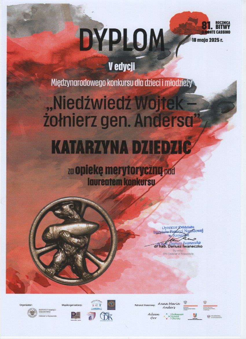 Nasza szkoła postanowiła uczcić to niezmiernie ważne wydarzenie. Zorganizowaliśmy konkurs: "Wiersz o Janie Pawle II". Uczniowie pisali utwory poetyckie opiewające wielkość naszego papieża. Walory artystyczne tych dzieł oceniała komisja w składzie: mgr Natalia Stephens, mgr Renata Weber i mgr Paweł Wrona . Nauczyciele wyłonili zwycięzcę, a okazała się nią uczennica klasy 7 Laura Kochanowicz. Wszyscy uczestnicy konkursu otrzymali dyplomy i nagrody, które zostały wręczone 30 kwietnia 2025 roku na akademii z okazji rocznicy uchwalenia Konstytucji 3 Maja.