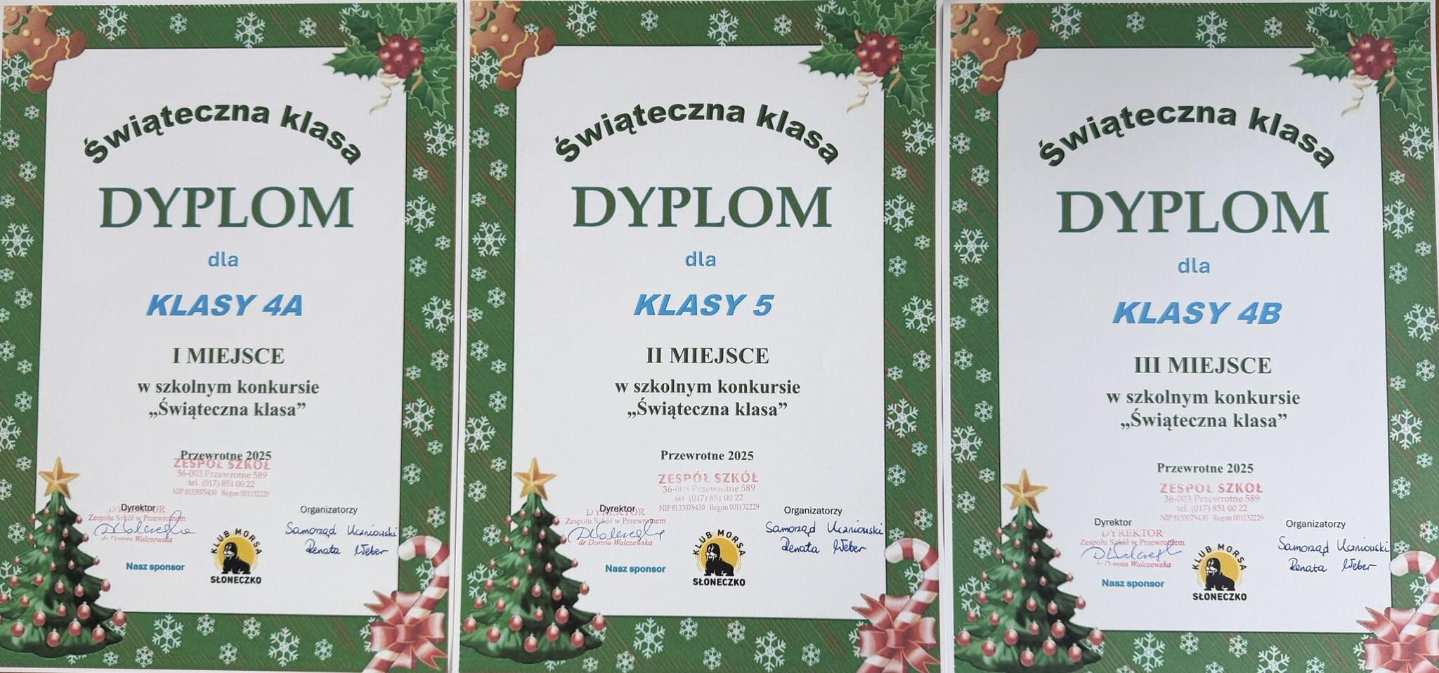 Tradycją w naszej szkoły jest organizowanie świątecznego konkursu ph , „Świąteczna klasa”. Celem konkursu było wprowadzenie w świąteczną atmosferę oraz rozwijanie kreatywności i współpracy zespołowej. Oceny przepięknie przyozdobionych klas dokonało jury, które brało pod uwagę pomysłowość, estetykę, zaangażowanie i świąteczny klimat. Zwycięzcy otrzymali nagrody ufundowane przez Klub Morsa „ Słoneczko”. Naszym sponsorom składamy serdeczne podziękowania. Laureatami konkursu zostały: I miejsce zdobyła klasa IVa, II miejsce uzyskała klasa Va , natomiast III miejsce przypadło klasie IVb. Pozostałe klasy otrzymały nagrody pocieszenia. Wszystkim uczniom, którzy zaangażowali się w konkurs dziękujemy i życzymy powodzenia w Nowym Roku.