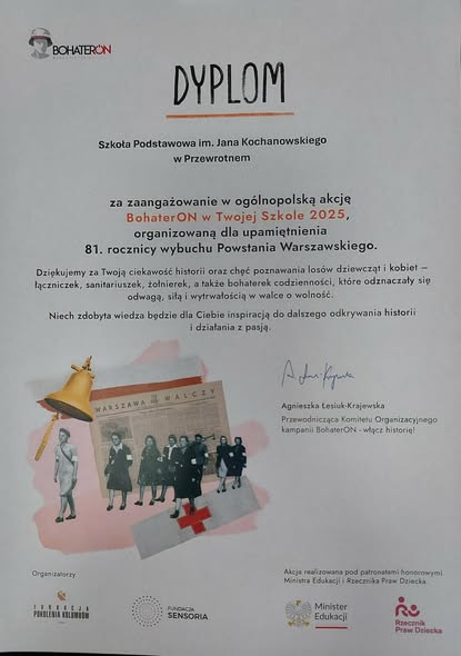 Po raz kolejny włączyliśmy się w akcję BohaterON w Twojej Szkole. Jest to ogólnopolska kampania o tematyce historycznej BohaterON – włącz historię! , która ma na celu upamiętnienie, uhonorowanie i bezpośrednią pomoc uczestnikom Powstania Warszawskiego, edukację społeczeństwa, a także promocję patriotycznych postaw i historii Polski XX wieku. Dla naszych uczniów jest to bardzo ważna lekcja historii i patriotyzmu. Nauczycielki historii przypomniały o poświęceniu i odwadze jaką kierowali się powstańcy. Naszym obowiązkiem jest pielęgnowanie narodowej tradycji.