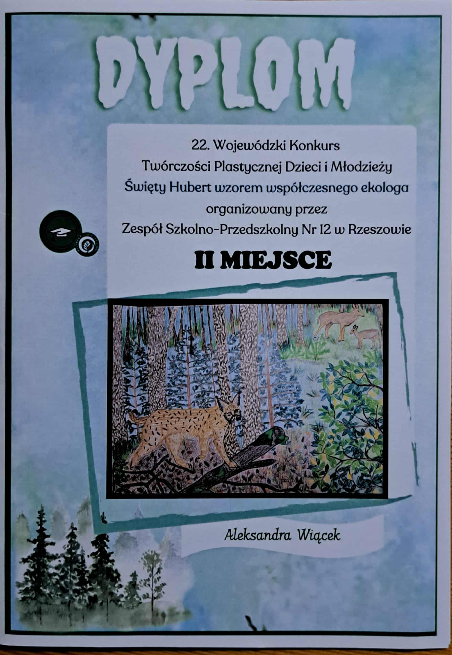 Uczennica klasy 8 Maja Dworak zdobyła I miejsce za wykonanie pracy plastycznej na temat: Święty Hubert i zwierzęta w akwarelowym lesie.